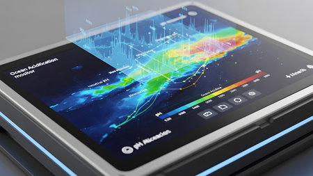 A close-up of a digital monitor displaying ocean acidification data with a geographical heatmap...