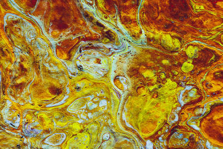 Macro view of acrylic pour painting with cells and cracking in blue green and orange