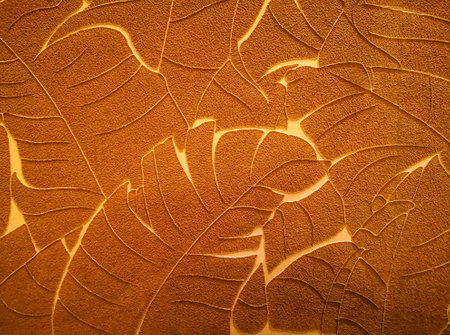 Chocolate color grainy textured monstera leaf shape texture background.Leaf pattern on the orange wall. Texture. Background. Copy space.