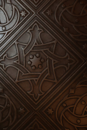 Old wooden door with a metallic pattern close-up. The cathedral Notre-Dame de Paris