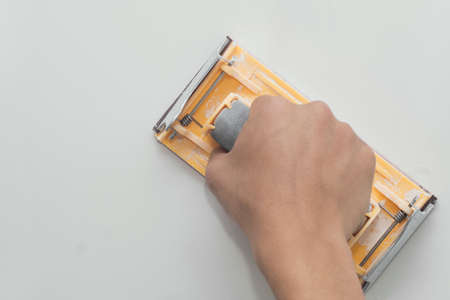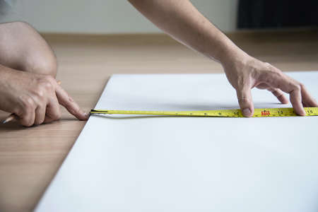 Man using measure hand tool doing wallpaper cutting work in home construction site, people with hand tool object concept