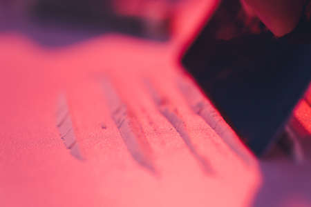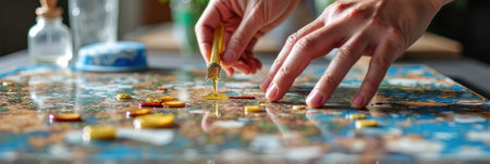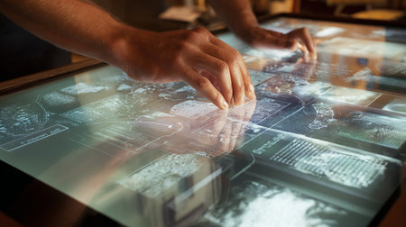 Close up of a hands working with precision on reflective surface. Photo with a subtle grain, soft focus blur