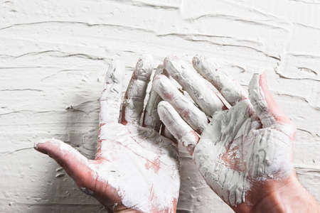 Builder Hand White Plaster Stucco Wall Worker Flat Lay Construction Repair Concept