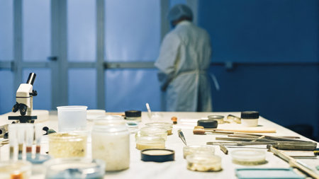 Detailed view of a cluttered workbench featuring an array of organic samples in jars and tools for dissecting with a senior biohackers silhouette in the background emphasizing an.