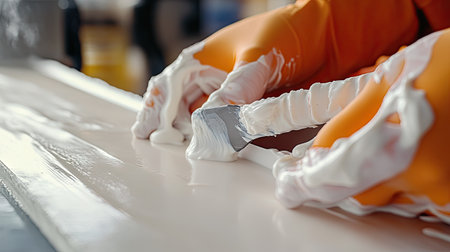 A professional smoothing out silicone caulk with a tool for a perfect finish