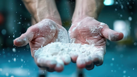 A close-up view of hands holding chalk powder in a gym, emphasizing preparation and focus in fitness activities like weightlifting and climbing.
