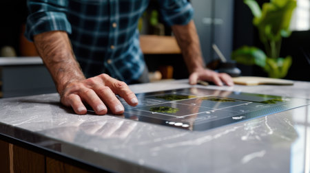 A person engages with a sleek touchscreen display on a marble countertop in a stylish kitchen, showcasing modern technology in a contemporary home setting.