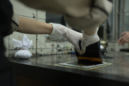 Closeup medium shot of flexographic plate cleaning process showing hands carefully scrubbing flexible plates to ensure precise ink removal.