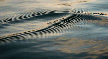 This image captures the serene beauty of gentle ripples on the surface of a body of water, likely a lake or ocean, during sunset. The soft, golden light reflects off the water, creating a warm and peaceful ambiance. The ripples, caused by a gentle breeze or a subtle disturbance, add a sense of movement and life to the otherwise calm scene.