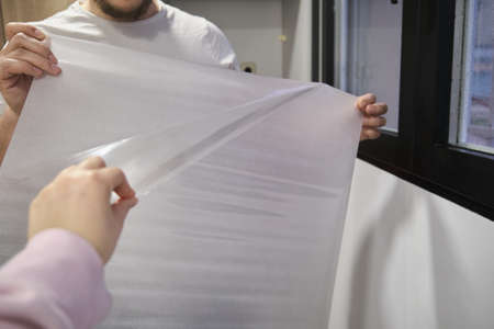 Young latin man taking off the plastic to install frosted window vinyl on the window glass.