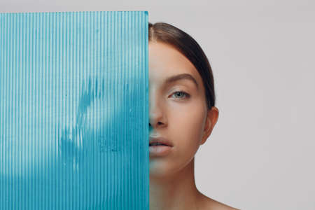 brunette young woman looking at camera through polyethylene on gray, ecology concept