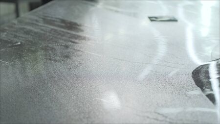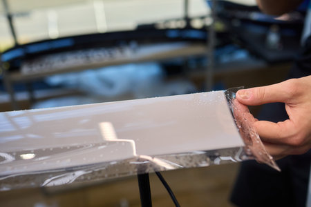 Transparent film, car paint protection, wrapping specialis. Car detailing. Selective focus.