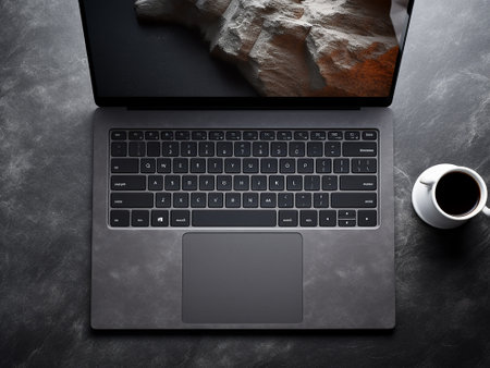 Top view modern workspace with laptop computer and coffee cup on black table.