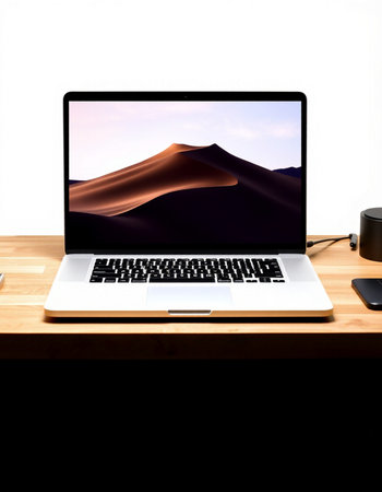 Laptop on wooden desk with dunes and coffee cup on white background
