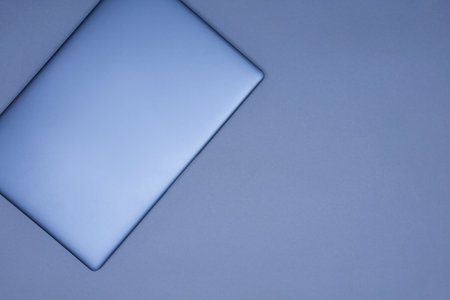 Closed silver laptop on a gray background. Top view.