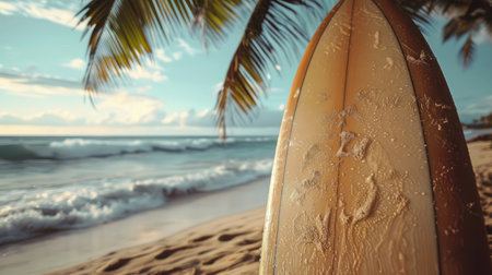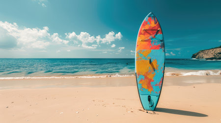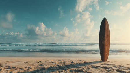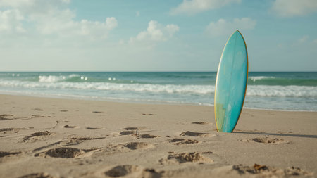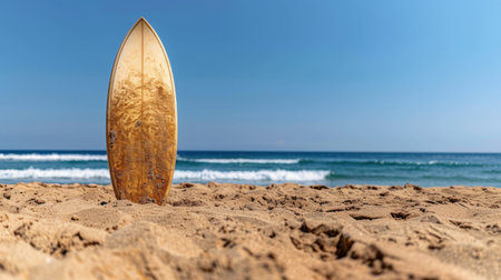 Surfboard stands on sandy beach, with clear blue sky and gentle waves in background, evoking sense of tranquility and adventure