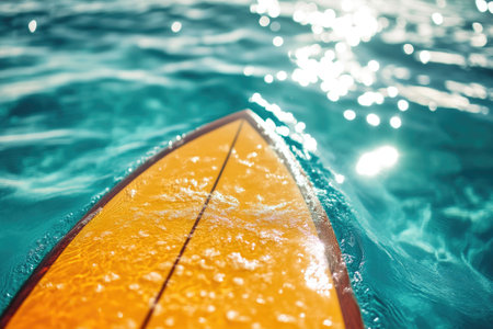 A yellow surfboard peacefully floats in the middle of a vast body of water, showcasing the exhilarating sport of surfing, A surfboard's perspective of a surfer mid-ride, AI Generated
