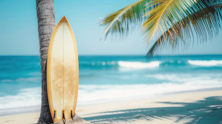 Surfboard against the backdrop of a seascape, beach and palm trees, active recreation concept, advertising for surfing training, copy space