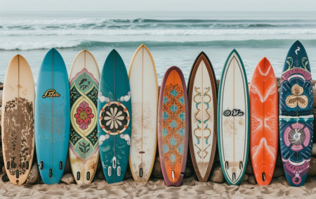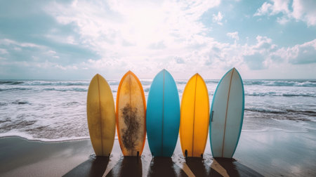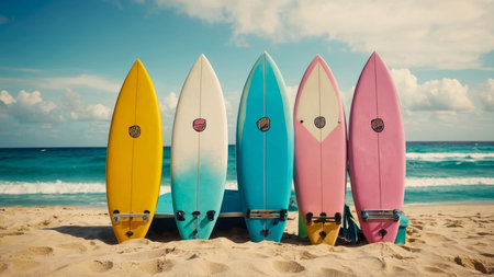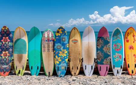 Surfboards in vibrant colors stand tall against a stunning sky capturing beach vibes and joy.