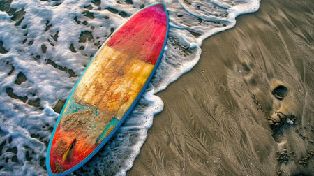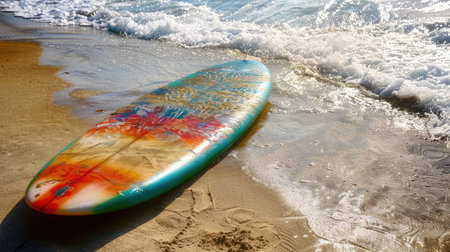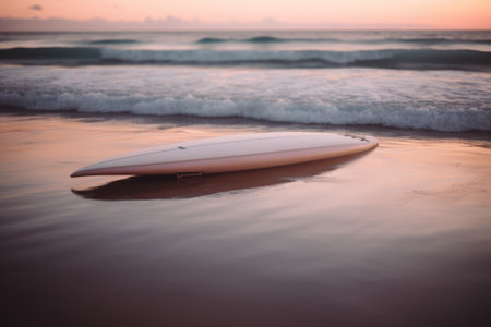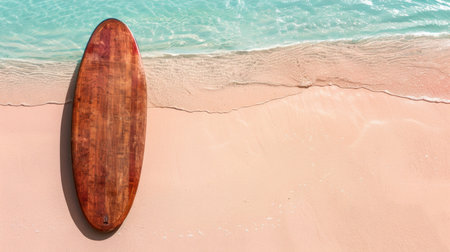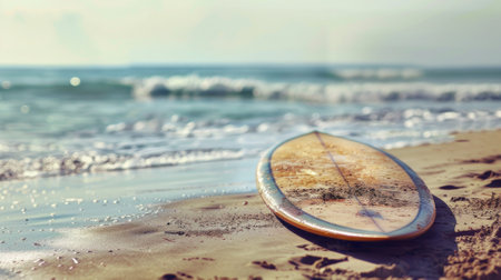 Wooden surfboard rests on sandy beach, with gentle waves lapping at shore. serene pastel colors of water and sand create tranquil atmosphere, inviting relaxation and adventure