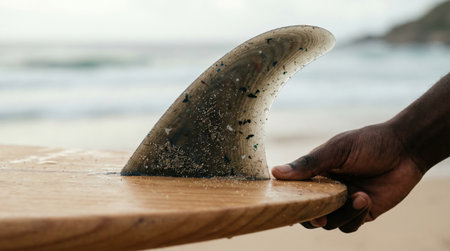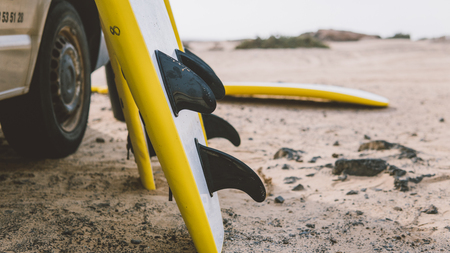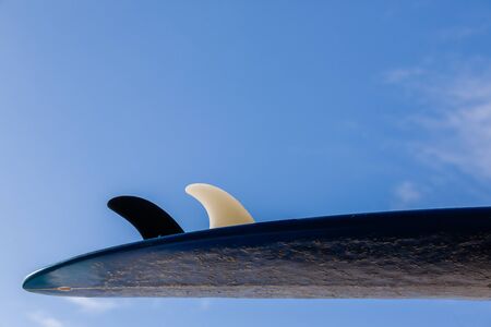 Surfboard tail fins wax closeup detail surfing equipment.