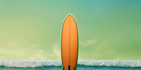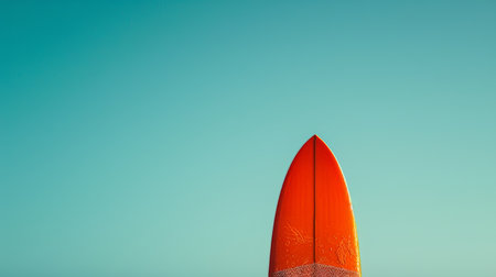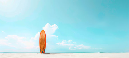 Minimalist photo of a lone surfboard standing against a blue sky on a deserted beach. Concept of summer, surfing, beach activities, and coastal lifestyle. Space for text. Banner