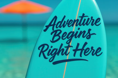 Surfboard With Adventure Begins Right Here Text On Tropical Sea