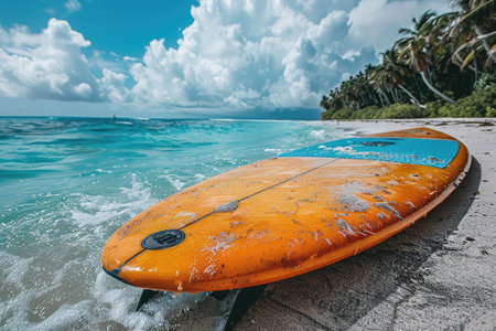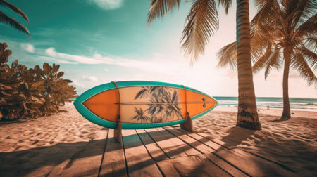 Surfboard on tropical beach. Generative AI
