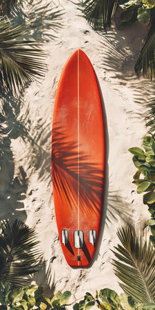 red surfboard on tropical sandy beach