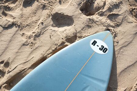surf board lying on the sand close-up. water extreme sports in the tropics