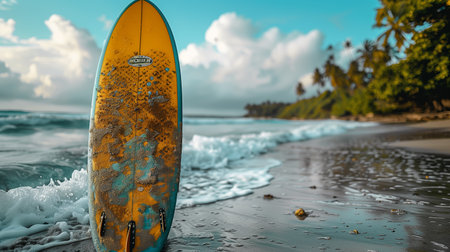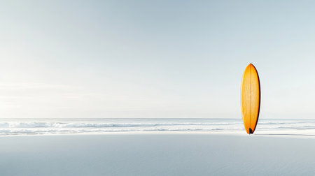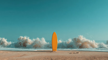 A yellow surfboard stands on a sandy beach, set against the backdrop of ocean waves and a clear blue sky. The composition features a symmetrical arrangement, with the surfboard as the central focus. The image uses natural lighting to create soft shadows, suitable for use in promotional materials or editorial content.