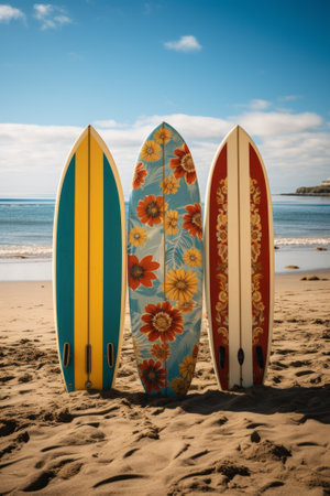 Three surf boards with vivid and eye-catching designs standing gracefully in the sand of an ocean beach