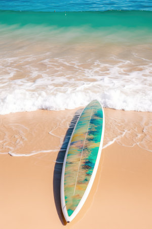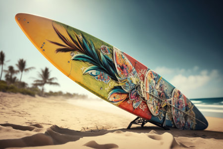 A colorful surfboard rests on the sandy shore of a tranquil beach, surrounded by lush greenery and framed by a clear blue sky and gentle ocean waves.