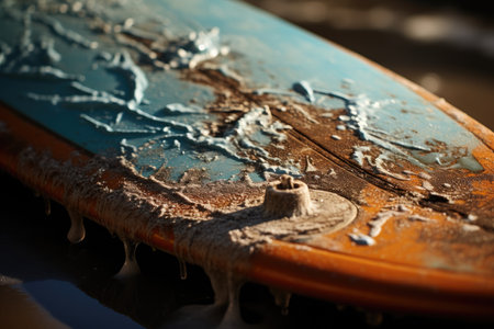 A worn-out surfboard covered in rust sits motionless on the surface of the ocean, Close-up of a distressed surfboard with chipping paint and a background of crashing waves, AI Generated