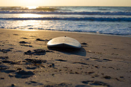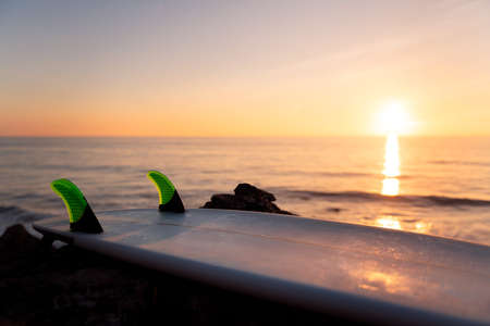Surfboard on the beach at sunset. Surfing concept.