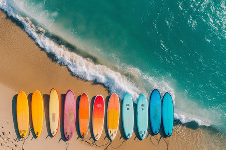 A row of surfboards neatly arranged on the sandy beach ready for a day of riding the waves, An aerial view of colourful surfboards lined up on the beach, AI Generated