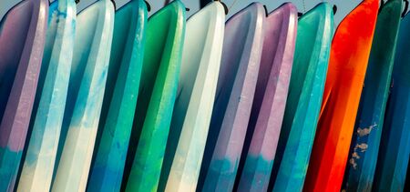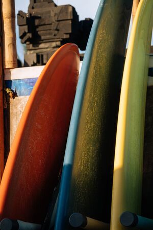 Set of colorful surfboard for rent on the beach. Multicolored surf boards different sizes and colors surfing boards on stand, surfboards rental place