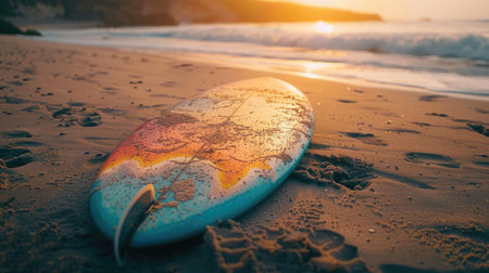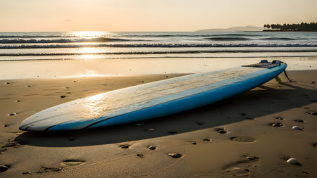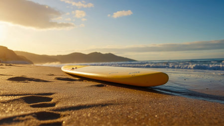 A surfboard rests on the beach as the sun sets, casting a golden glow over the water. The wind waves gently lap at the shore, creating a peaceful and serene natural landscape AIG50