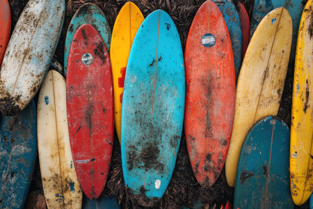 Old and weathered surfboards in various colors create a striking visual along the shore. Each board displays unique patterns and marks, showcasing a history of adventures in the ocean. The bright hues stand out against the sandy backdrop.