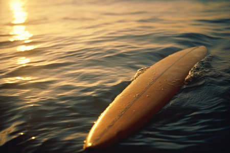 surfboard on calm water surface at sunset.