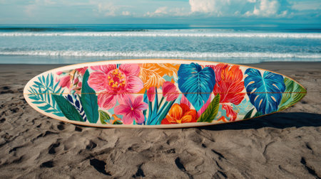 Brightly colored surfboard showcasing tropical flowers set against a peaceful sandy beach scene under a clear blue sky.