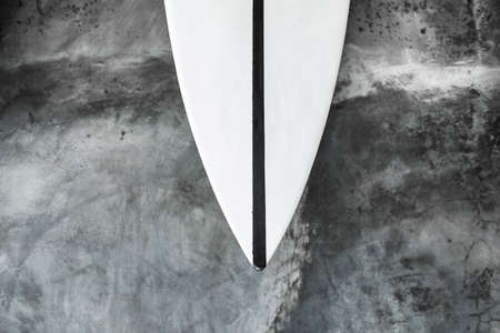 Black and white color surf board on gray concrete wall background. Contemporary interior design of cafe in minimalist style. Dark shabby texture.