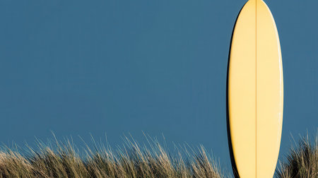 This vibrant image features a bright yellow surfboard set against a clear blue sky, with tall grass in the foreground, capturing the essence of summer adventures.