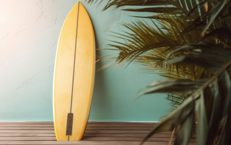 Yellow surfboard and palm leaf on wooden deck. Copy-space.