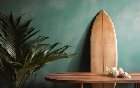 Wooden table with surfboard and flower on green wall background.