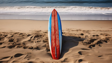 beach red white blue boards illustration vibrant colors, contrast sand, waves summer beach red white blue boards