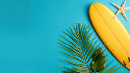 A vibrant yellow surfboard rests next to lush tropical leaves and a starfish on a teal backdrop, creating a lively beach-inspired composition perfect for summer themes.