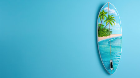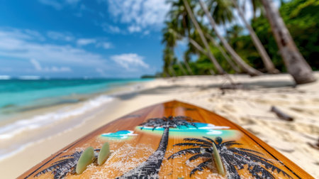 A vibrant surfboard featuring a stunning tropical beach scene, perfect for summer themes, beach decor, or promotion of ocean activities.