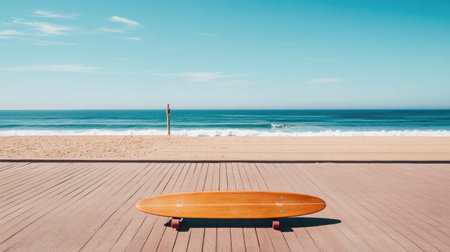 A solitary wooden skateboard rests on a wide boardwalk, offering a perfect view of gentle ocean waves and a bright blue sky, embodying summer joy and peaceful vibes.