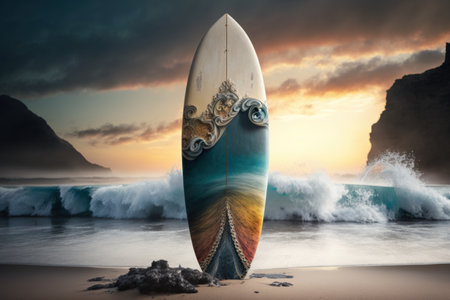 A bright surfboard stands elegantly on a sandy beach, contrasted against crashing turquoise waves and a moody cloudy sky, perfect for summer adventures.